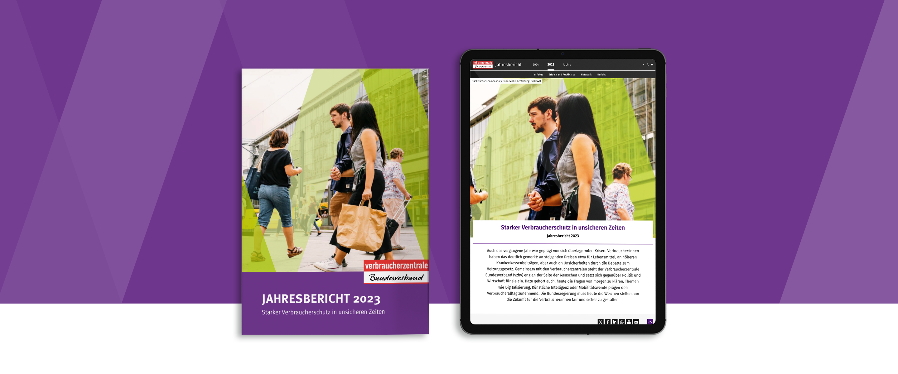 Auftrag: Der Jahresbericht stellt zentrale verbraucherpolitische Erfolge des vzbv dar und richtet sich vor allem an den Zuwendungsgeber sowie politische Entscheidungsträger:innen. Der bisherige Jahresbericht ist ein gedrucktes Magazin, das mit der Neuausrichtung in ein digitales Format überführt werden soll, das die bisherigen Inhalte für das Medium neu aufbereitet: multimedial, grafisch ansprechend und strukturell klar gegliedert, barrierearm.